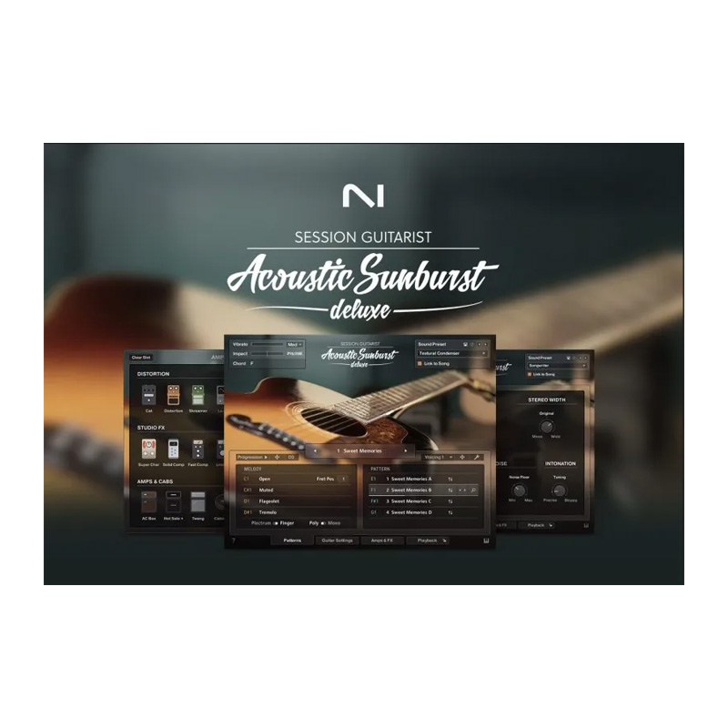 Acoustic Sunburst Deluxe delivers deep, full-bodied guitar tones that are perfect for any style of music. Use the Light Guide to effortlessly switch between the melody articulations and patterns of your virtual acoustic guitar. Explore a vast library of picked and strummed patterns covering a vast range of genres.